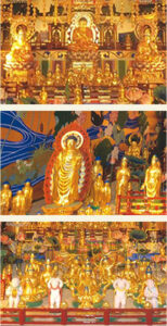 中央に阿弥陀如来、観世音菩薩、勢至菩薩と十六観菩薩が安置され、宝樹、宮殿楼閣、宝池には五色の蓮華が咲きそれぞれの光を放っております。